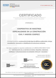 Desde el 01 de noviembre del 2021, formamos parte de la Cámara de Economía Popular y solidaria de Pichincha, en el sector de la construcción.